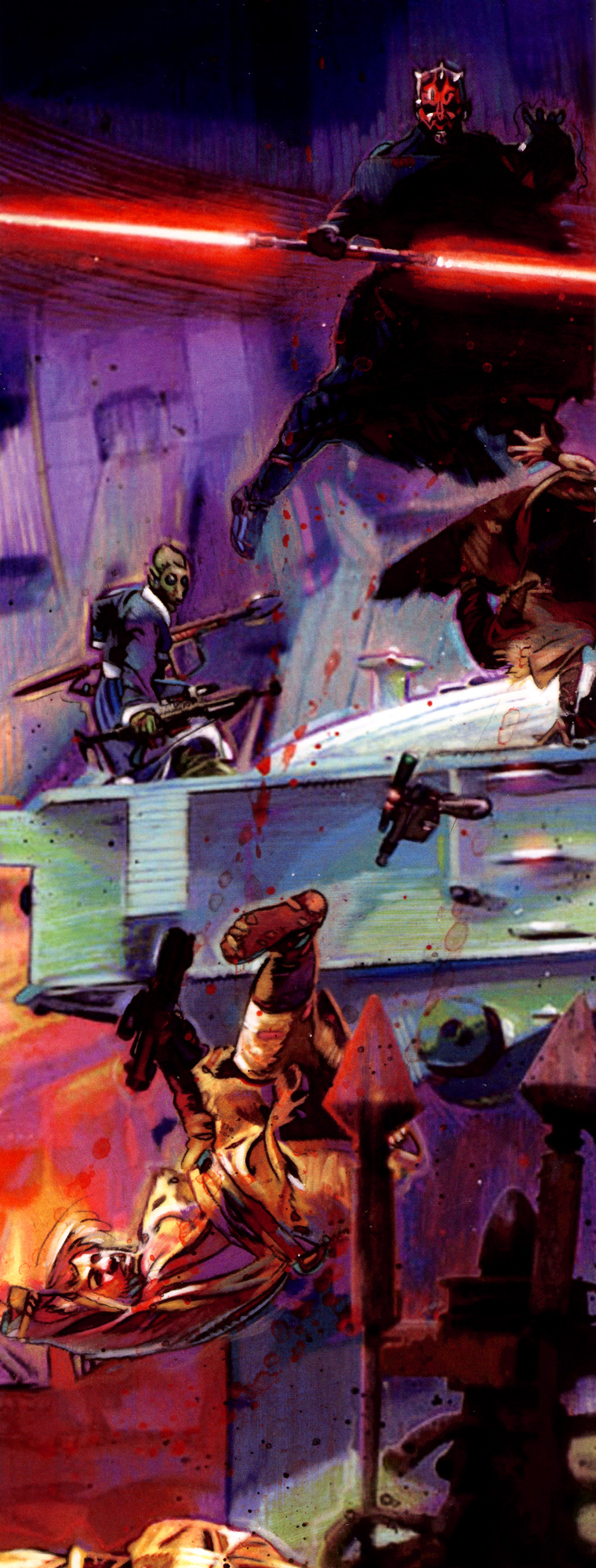 | Darth Maul destroys the Black Sun crime syndicate, as depicted in the Darth Maul comic miniseries. Image is from The New Essential Chronology and downloaded from Wookieepedia. |